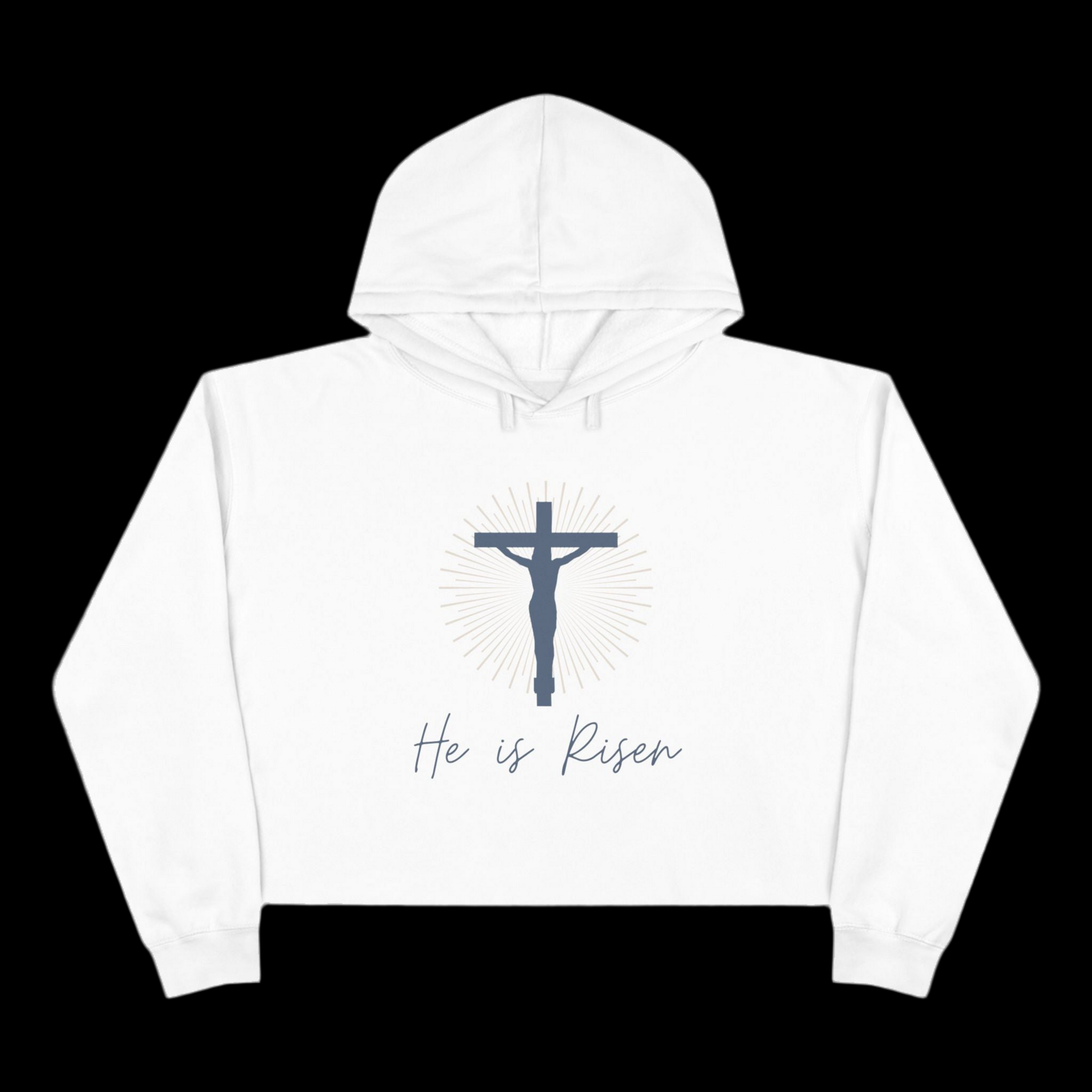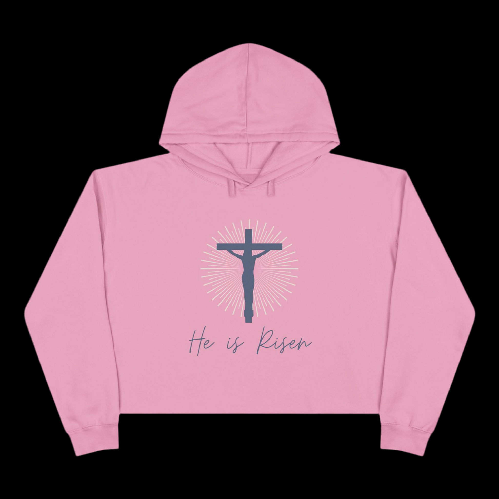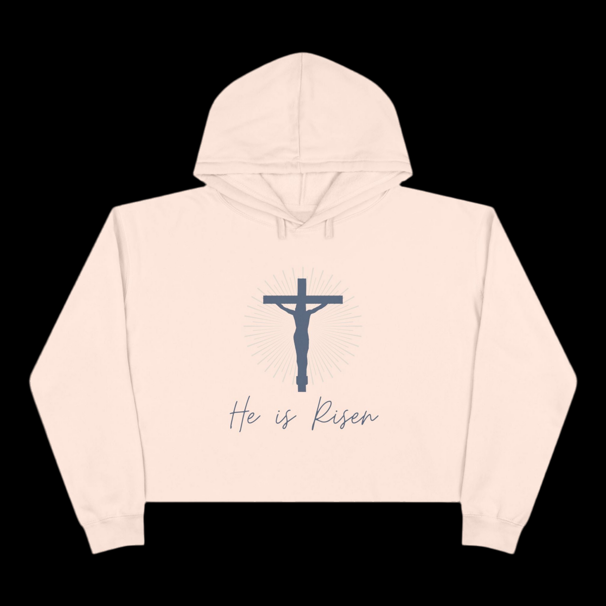 Celebrate your faith in style with this beautifully soft and inspiring cropped hoodie. Featuring a powerful silhouette of the cross and the message “He is Risen”, this design is a reminder of hope, grace, and new beginnings. Perfect for teens who want to wear their beliefs proudly, this hoodie pairs effortlessly with jeans or leggings for a cozy, everyday look. With its warm blush tone and relaxed fit, it's a go-to for church events, casual outings, or quiet moments of reflection. Let your light shine—because He is risen!