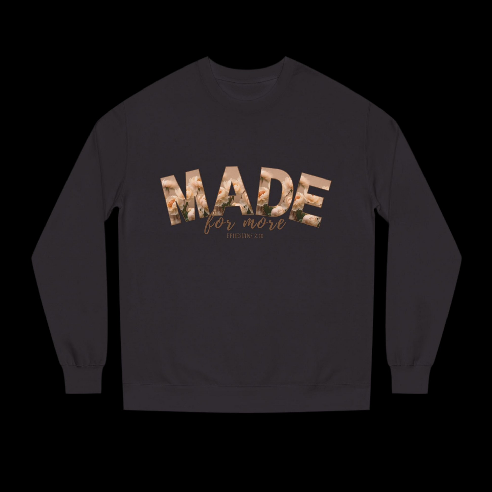 This cozy crewneck sweatshirt features a soft, minimalist design with the bold statement "MADE for more" across the chest. The word "MADE" is filled with a subtle floral pattern, adding a touch of elegance, while the delicate script underneath emphasizes purpose and inspiration. Below, the verse reference "Ephesians 2:10" ties the message back to its biblical foundation, serving as a daily reminder of one’s greater calling. The neutral cream tone of the sweatshirt complements the soft floral aesthetic, making it versatile for casual, everyday wear while still standing out with a meaningful message.